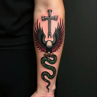 This tattoo showcases a striking abstract circular motif rendered in a minimalist style. The design utilizes clean linework and a limited color palette to create a visually appealing and symbolic piece. The simplicity allows for personal interpretation and resonates with those seeking understated body art. It's a testament to the power of less, demonstrating how impactful a simple shape can be when executed with precision.