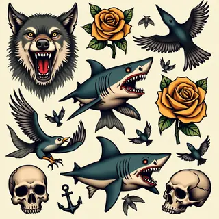 The composition emphasizes balance and symmetry, creating a visually captivating piece that speaks to strength, beauty, and the natural world. American Traditional tattoos are known for their iconic imagery and enduring appeal.