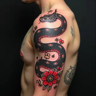 This striking full-sleeve tattoo showcases a dynamic composition of a serpentine figure intertwined with floral motifs, rendered in the traditional Japanese Irezumi style. The snake, a powerful symbol in Japanese culture, represents transformation, healing, protection, and wisdom. The vibrant colors and meticulous detailing exemplify the artistry of this ancient tattooing tradition.