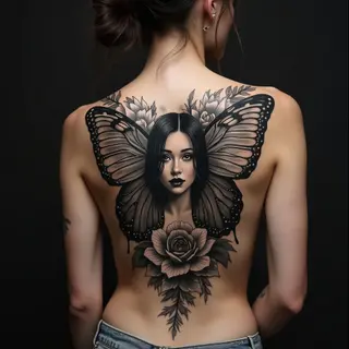 This striking back tattoo showcases a stylized representation of our solar system, intricately woven with geometric patterns and symbolic elements. The design utilizes linework and subtle shading to create depth and visual interest, evoking a sense of wonder and cosmic connection. The placement across the upper back allows for a large-scale depiction, emphasizing the vastness of space. This style is popular among those seeking meaningful and visually complex tattoos.