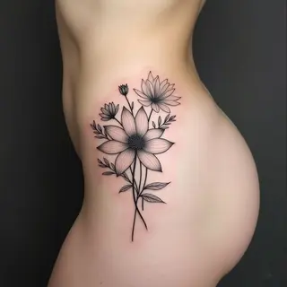 This tattoo showcases a cluster of roses and foliage delicately placed on the hip. The linework is fine and detailed, creating a soft and elegant aesthetic.