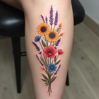 This tattoo features a vibrantly colored butterfly rendered in a traditional illustrative style on the thigh. The design emphasizes bold outlines, clean lines, and a limited color palette to create a classic aesthetic.