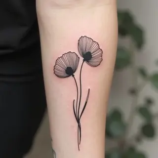 This tattoo showcases a graceful arrangement of flowers and foliage rendered in a fine line style. The design follows the natural curve of the forearm, creating a flowing and organic aesthetic.