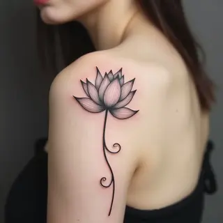 This tattoo showcases a meticulously rendered lotus flower, symbolizing purity, enlightenment, and rebirth. The illustrative style emphasizes the delicate details of each petal and leaf, creating an elegant and visually captivating design.