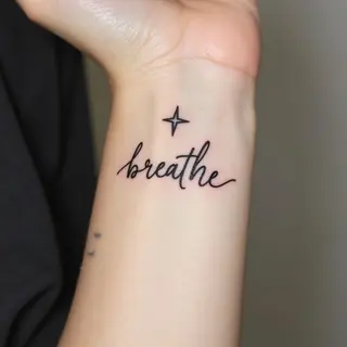 This tattoo showcases a harmonious blend of elegant script lettering and a detailed rose motif, seamlessly integrated onto the forearm. The script appears to spell out a word (unclear from image), while the rose adds a touch of classic beauty and personal significance. The shading techniques create depth and dimension, enhancing the overall visual impact. This style is popular for its ability to combine personalized text with meaningful imagery.