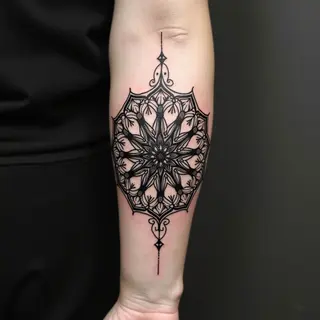 This captivating tattoo showcases a geometric mandala design meticulously applied to the thigh. The intricate pattern utilizes precise linework and solid black shading to create depth and dimension.