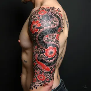 This captivating tattoo showcases a geometric mandala incorporating a stylized human face. The design blends intricate patterns with portraiture, creating a visually arresting piece of body art. The precise linework and symmetrical composition evoke feelings of balance and harmony.