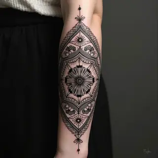 A Complex Geometric Mandala Tattoo with a Lotus Flower and Eye Symbol