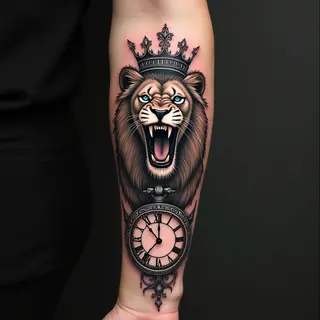 This impressive half-sleeve tattoo depicts a powerful lion, rendered in realistic black and grey tones. The inclusion of a crown adds a regal element to the design, symbolizing strength, leadership, and nobility.