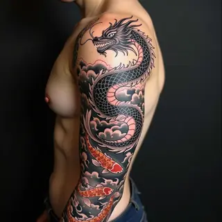This striking tattoo exemplifies the classic Japanese Irezumi style. The full sleeve design depicts a powerful dragon intertwined with floral elements, rendered with meticulous attention to detail.