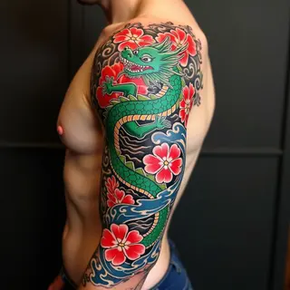 This striking tattoo showcases a classic Japanese style composition featuring koi fish swimming amongst stylized floral elements. The design is executed as a full sleeve, demonstrating mastery of traditional Irezumi techniques.
