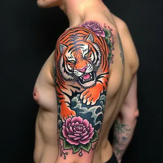 This striking tattoo exemplifies the artistry of Japanese Irezumi, featuring a dynamic dragon winding across the upper arm. The composition utilizes bold outlines, vibrant color palettes, and traditional motifs characteristic of this style.