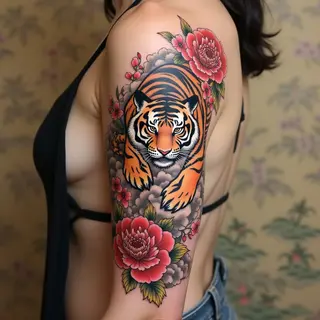 This intricate full-back tattoo exemplifies traditional Japanese Irezumi style. The central motif features a dynamic dragon intertwined with vibrant koi fish swimming amidst stylized waves and floral elements. The composition emphasizes strength, perseverance, and transformation – common themes in Japanese folklore. The shading is meticulously executed, creating depth and dimension while maintaining the characteristic bold outlines of irezumi. This piece demonstrates mastery of traditional techniques and a deep understanding of symbolic meaning within Japanese culture.