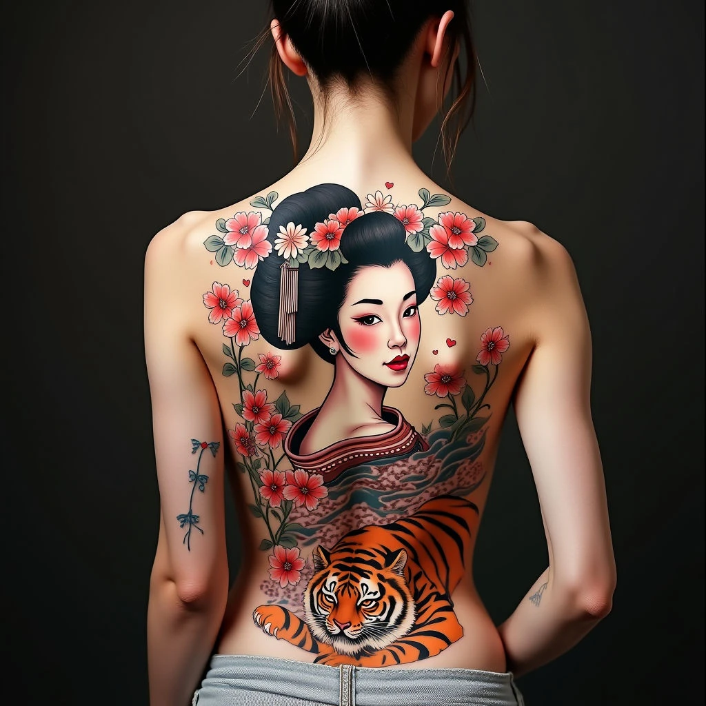 This striking full back tattoo exemplifies the rich tradition of Japanese Irezumi. The central figure is a Geisha, rendered with delicate detail and surrounded by a vibrant array of floral elements – likely cherry blossoms and chrysanthemums – alongside a tiger motif and stylized wave patterns. The composition demonstrates mastery of traditional techniques, utilizing bold outlines, smooth shading, and a carefully balanced color palette to create a visually arresting piece.