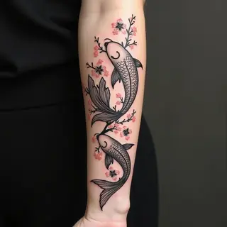 This impressive full sleeve tattoo showcases classic elements of Japanese Irezumi. The dynamic composition features vibrant koi carp navigating stylized waves, a common motif symbolizing perseverance and strength.