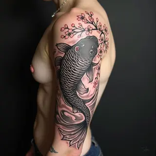 This striking full sleeve tattoo embodies the essence of traditional Japanese Irezumi. The flowing lines depict a scene of koi fish battling against powerful waves, symbolizing determination and overcoming adversity.