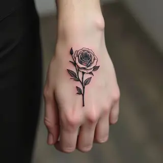 This captivating tattoo showcases a meticulously rendered rose seemingly blossoming from a stack of currency. The placement on the hand allows for dynamic display and interaction with the viewer. The use of blackwork shading creates depth and contrast, emphasizing the symbolic interplay between natural beauty and material wealth.