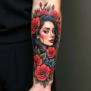 The artist utilizes bold outlines characteristic of American Traditional tattooing but incorporates the shading and detail often found in Neo-Traditional work. The composition flows seamlessly around the arm, creating a visually captivating piece.