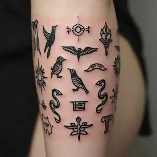 This tattoo exemplifies a modern interpretation of traditional tattooing, incorporating elements of abstract realism and trash polka aesthetics. The fragmented portrait creates a sense of deconstruction and raw emotion, while the bold red and black color palette adds intensity and visual impact. The inclusion of typographic chaos further enhances the rebellious nature of this design. It’s a powerful statement blending classic imagery with contemporary artistic expression.