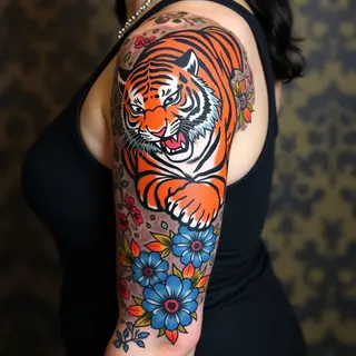 This tattoo showcases a classic Japanese Irezumi aesthetic, blending floral motifs with flowing waves. The delicate flowers represent resilience and beauty amidst life's challenges, while the waves symbolize power and constant change. The semi-permanent nature allows for experimentation without long-term commitment.
