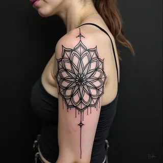 This striking tattoo features a detailed depiction of a sword rendered in a minimalist style. The clean lines and precise execution create a visually impactful piece that speaks to themes of strength, honor, and resilience. The placement on the forearm allows for easy visibility and showcases the artistry of the linework technique.