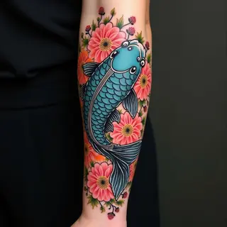 A captivating Japanese Irezumi tattoo featuring koi fish, cranes, and cherry blossoms