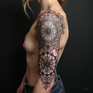 The blackwork technique emphasizes depth and detail, creating a visually rich experience that speaks to both strength and beauty. This design exemplifies how seemingly disparate artistic styles can harmonize to create something truly unique.