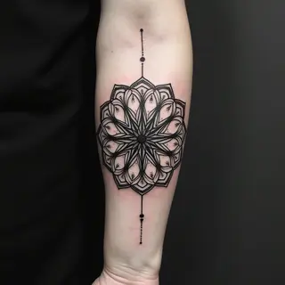 Geometric tessellations are interwoven with flowing lines, creating a visually captivating and spiritually resonant piece. The precision in execution highlights the artist's skill in translating intricate designs onto skin.