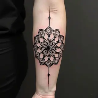 This temporary tattoo features an intricately designed mandala with a strong geometric influence. The design is characterized by precise lines, symmetrical patterns, and a calming visual balance.