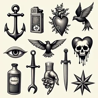 This striking leg sleeve showcases a masterful application of American Traditional tattooing principles. The design incorporates a complex interplay of floral motifs, stylized animal forms (likely a bird or serpent), and symbolic elements like daggers or keys, all rendered with bold outlines and traditional shading techniques.