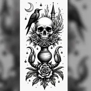Motifs include skulls, birds, roses, hands, and geometric patterns, each rendered with meticulous detail and a sense of timelessness. The overall aesthetic is clean and impactful, demonstrating the versatility of American Traditional tattooing.