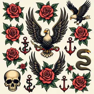 This piece showcases a quintessential American Traditional tattoo design. The composition is densely packed with iconic imagery – swallows symbolizing hope and return, roses representing love and beauty, an anchor signifying stability, and a letter hinting at communication or longing. The bold outlines and shading are characteristic of the style, creating a timeless aesthetic. This arrangement lends itself well to placement on a larger area like a forearm or upper arm.