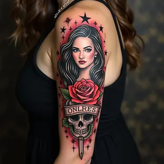 This impressive sleeve showcases the hallmarks of American Traditional tattooing: bold outlines, limited color palettes, and classic imagery. The composition is dynamic, flowing down the upper arm with a sense of movement and narrative.