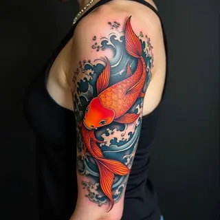 This arm sleeve showcases a classic example of Japanese Irezumi tattooing. The design prominently features koi fish, known symbols of perseverance, strength, and good fortune in Japanese culture. Accompanying the koi are delicate blossoms (likely cherry or plum), adding an element of beauty and transience. The tattoo utilizes traditional Japanese techniques to create depth and movement. The color palette is rich and vibrant, characteristic of this style. This piece demonstrates a mastery of line work and shading, creating a visually compelling narrative on the arm.