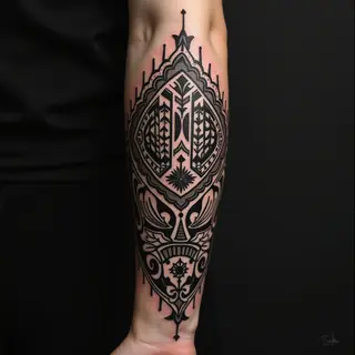 This geometric armband tattoo showcases a modern aesthetic through its clean lines and interconnected design. The abstract pattern creates visual interest while maintaining a sense of balance and strength.
