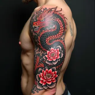 This impressive sleeve showcases a masterful blend of traditional American tattooing techniques. The composition features a portrait element integrated with intricate floral designs and geometric borders, all rendered in stark black and grey shading. The style’s emphasis on bold outlines and detailed imagery creates a visually striking and enduring work of art.
