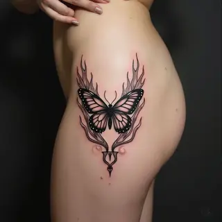 This tattoo showcases a beautifully rendered mandala incorporating a delicate butterfly motif. The geometric precision combined with the organic form of the butterfly creates a striking visual contrast. The placement on the thigh allows for a larger, more detailed design that flows naturally with the body's contours.