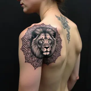 - Black and grey shading techniques add depth and realism, highlighting the musculature of the lions and the complexity of the mandala's design.