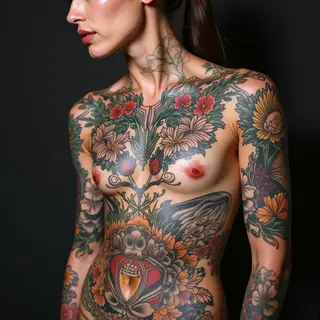 This chest tattoo showcases a blend of script lettering interwoven with detailed wing imagery. The blackwork style creates depth and contrast, emphasizing the intricate details within both the text and the feathered designs. The placement across the upper chest and extending to the neck suggests a significant personal meaning or commitment.