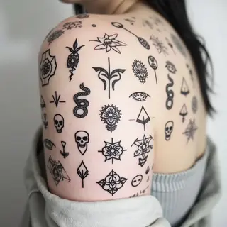 This flash sheet presents a curated selection of classic tattoo designs rooted in traditional aesthetics. The imagery evokes themes of love (roses), guidance (star), direction (arrow), protection (dagger), freedom (bird) and stability (anchor). Each element is rendered with bold outlines and clean lines, characteristic of the traditional style. These designs are readily adaptable to various placements on the body.