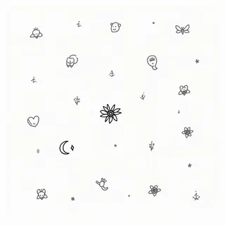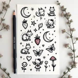 This collection showcases a range of small-scale tattoo designs intended as flash art. The style is characterized by clean linework and a playful mix of subjects, from celestial symbols to pop culture references. These miniature tattoos offer a versatile way to add personal meaning and visual interest to the body. The variety allows for individual expression or a cohesive collection.