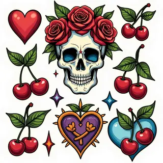 This collection presents a series of small, individual flash tattoos centered around natural motifs like mushrooms, crystals, floral elements, and stylized hearts with script lettering. The design utilizes fine linework to create a whimsical and delicate aesthetic. Each piece is intended as a standalone tattoo or can be combined for a larger composition.