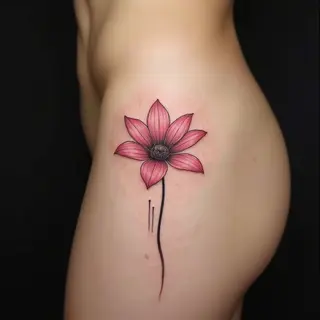 This piece showcases a detailed peony flower arrangement on the hip. The illustrative style emphasizes delicate linework and shading to create depth and dimension. Placement is key for maximizing visual impact and flow with the body's natural curves.