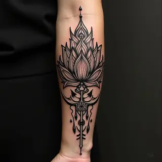 This tattoo showcases a powerful combination of blackwork and geometric design elements. The use of solid black ink creates a dramatic visual impact, while the precise geometric shapes add depth and complexity. This style is popular among men who appreciate bold statements and artistic expression.