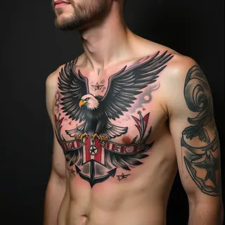 This striking tattoo showcases a neo-traditional style design covering the upper chest and extending onto the shoulders. The artwork incorporates detailed illustrations of birds, floral motifs, and geometric patterns, rendered with bold outlines and smooth shading. This style is known for its clean lines, vibrant colors (though muted in this instance), and classic appeal, making it a popular choice for men seeking impactful body art.