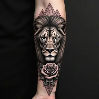 This impressive forearm tattoo showcases a majestic lion adorned with an ornate crown, symbolizing strength, royalty, and courage. The intricate details of the lion's fur and facial features are brought to life through skillful shading and linework. A landscape scene below adds depth and context to the design, creating a visually captivating piece of body art.