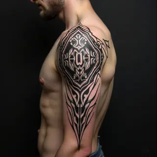Full sleeve tattoo: Realistic animal portraiture and geometric patterns