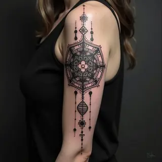 Striking Full Sleeve Tattoo: Geometric Precision and Organic Floral Forms