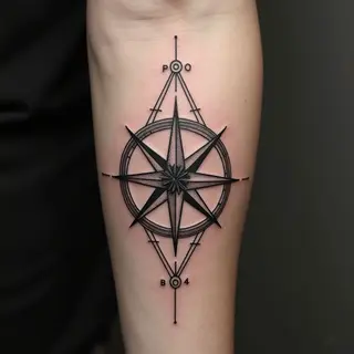 This geometric compass tattoo combines precision with artistry. The central compass rose is surrounded by intricate lines and shapes, creating a visually compelling design that speaks to direction, guidance, and exploration. The use of dotwork adds depth and texture, emphasizing the meditative process behind its creation.