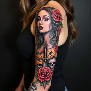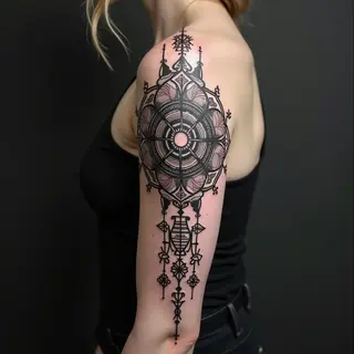 The interplay between sharp angles and delicate petals creates depth and visual interest, demonstrating a high level of skill in both geometric and illustrative tattooing techniques.
